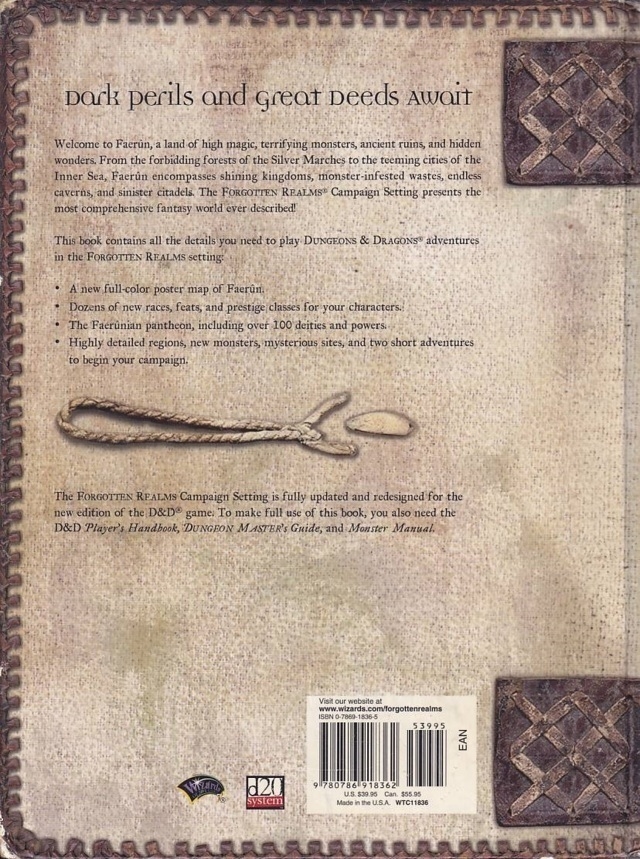 Welcome to Faerûn, a land of high magic, terrifying monsters, ancient ruins, and hidden wonders. From the forbidding forests of the Silver Marches to the teeming cities of the Inner Sea, Faerûn encompasses shining kingdoms, monster-infested wastes, endless caverns, and sinister citadels. The D&D 3 - Forgotten Realms Campaign Setting presents the most comprehensive fantasy world ever described!