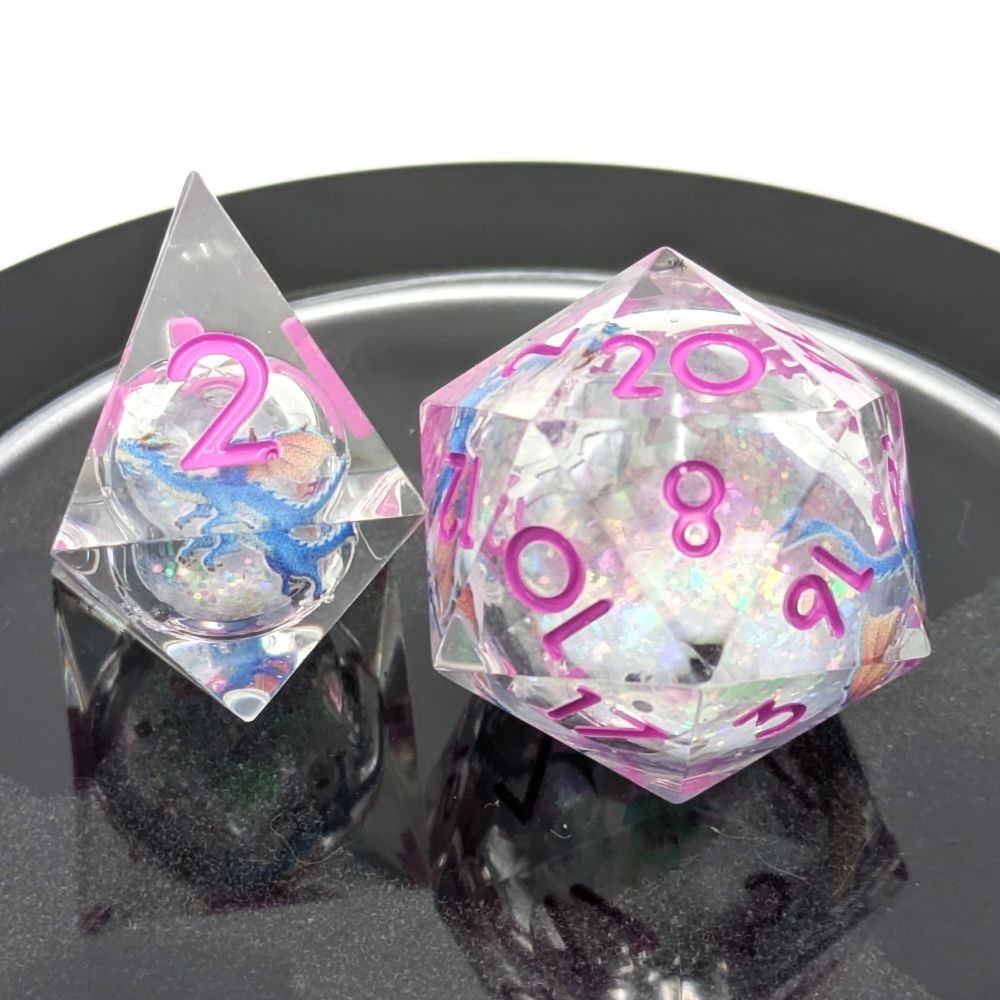 Disse klare, gennemsigtige Liquid Core Terninger med pink tal, blå drager og hvidt glitter er super fascinerende. Det smukker glimmer i midten hvirvler op, når man ruller terningen, så selv en Nat 1 er en glitterfest!