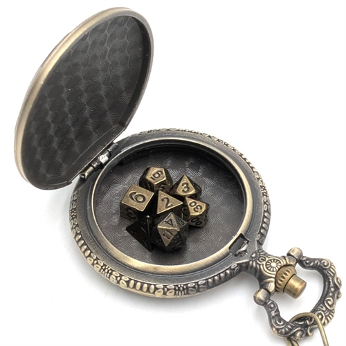 Disse mini metal terninger er super fede og bringer stil til dit rollespil! Terningerne er mellem 6mm og 8mm i størrelse; store nok til at du kan se, hvad du slår, og små nok til at passe i lommeurs-holderen. Ved et tryk på knappen åbner beholderen, som et rigtigt lommeur og du kan tage dine små terninger ud og rulle for din karakter.