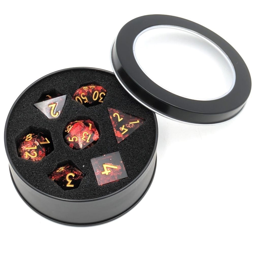 Disse Rubinterninger med guldflager er super smukke og bringer stil til dit rollespil! Perfekte til de spillere der vil have lidt ekstra liv på bordet, når der rulles.