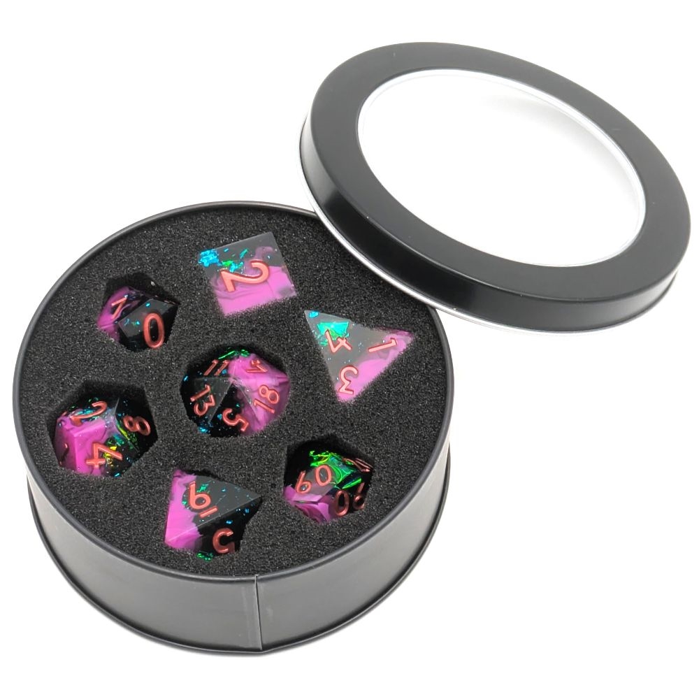 Sharp Edge Resin Dice Set - Purple Swirl Green glitter - Epic Dwarf Dice