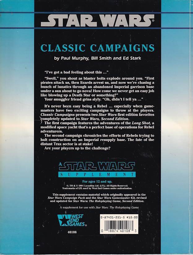 Star Wars D6 - Classic Campaigns is a Star Wars: The Roleplaying Game Supplement of 96 pages published by West End Games.