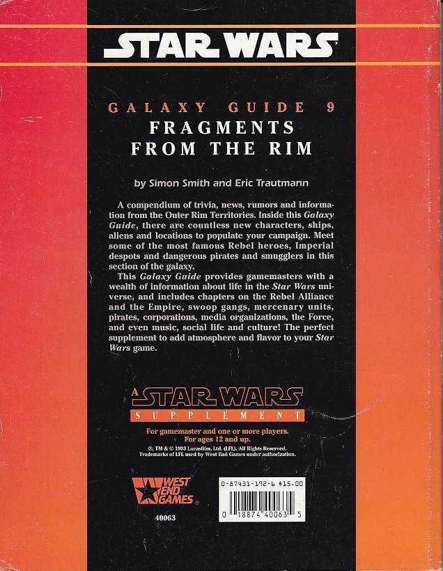 The Galaxy Guide 9  - Fragments of the Rim - Star Wars Supplement is a compendium of trivia, news, rumors and information from the Outer Rim Territories. Inside the Galaxy Guide 9 - Fragments of the Rim, there are countless new characters, ships, aliens and locations to populate your campaign. Meet some of the most famous Rebel heroes, Imperial despots and dangerous pirates and smugglers in  this section of the galaxy.