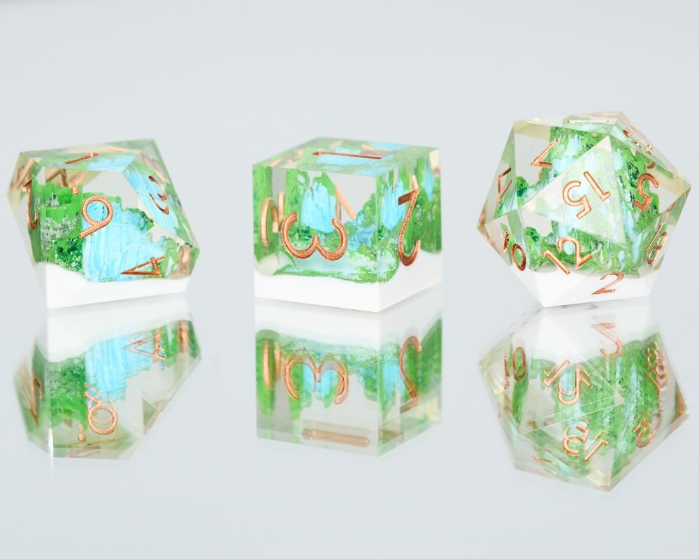 Disse klare terninger med grønne bjerge og en flod er super smukke og bringer stil til dit rollespil! Perfekte til de spillere der vil have lidt ekstra liv på bordet, når der rulles.