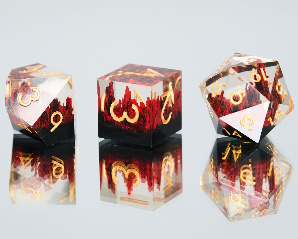Disse klare terninger med røde bjerge er super smukke og bringer stil til dit rollespil! Perfekte til de spillere der vil have lidt ekstra liv på bordet, når der rulles.