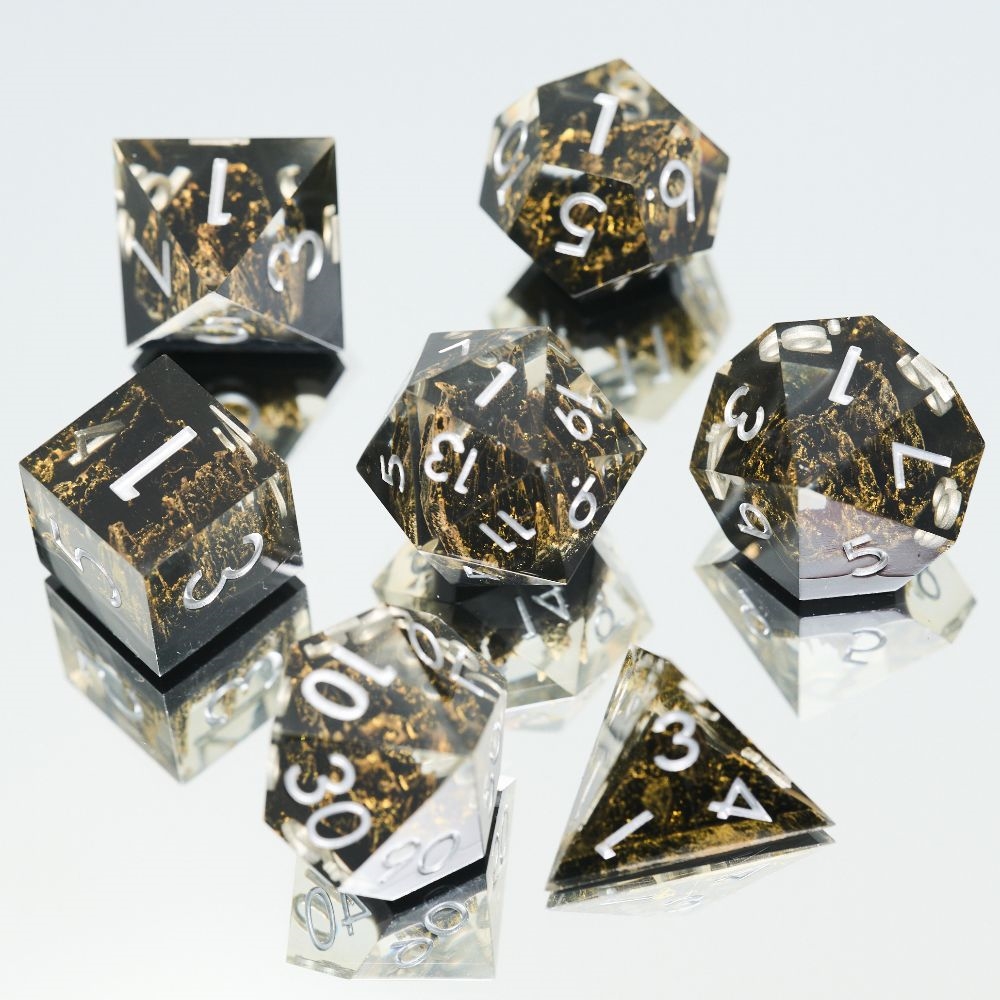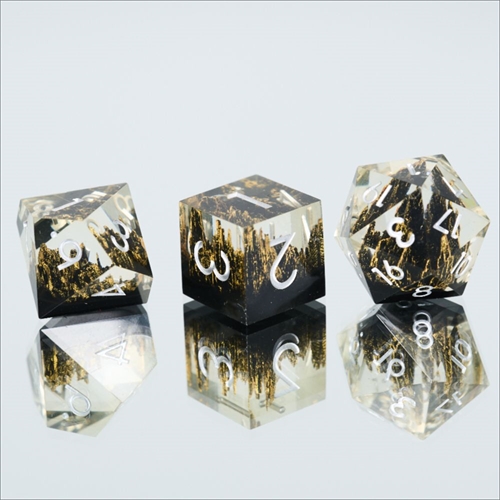 Disse klare terninger med gyldne bjerge er super smukke og bringer stil til dit rollespil! Perfekte til de spillere der vil have lidt ekstra liv på bordet, når der rulles.