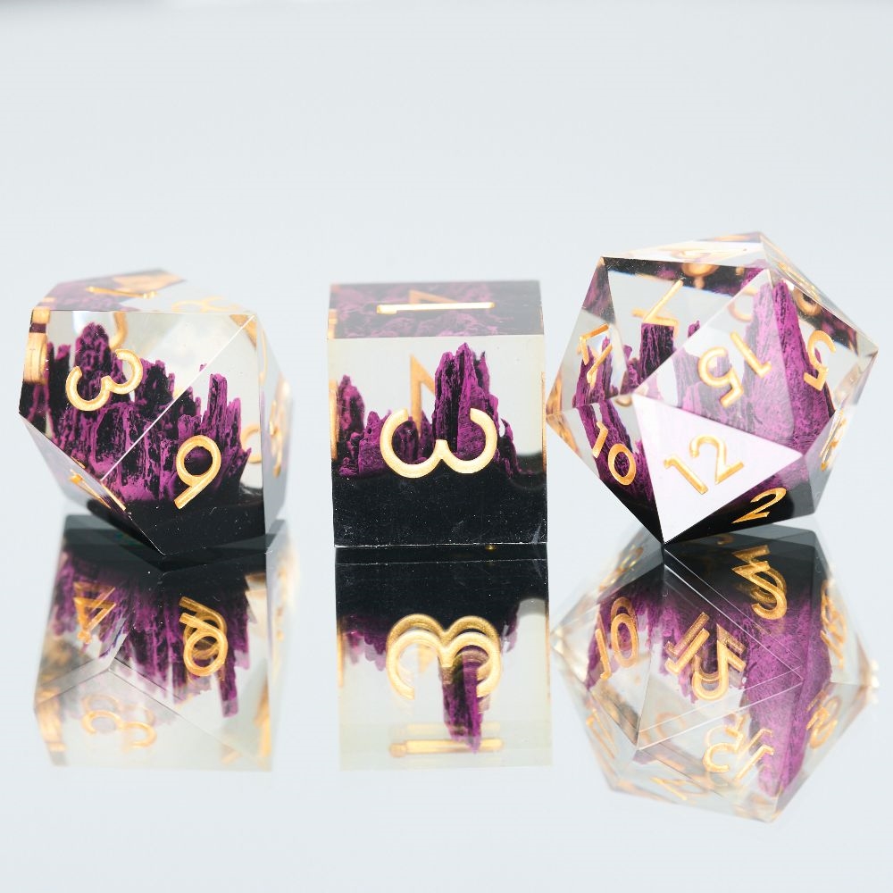 Disse klare terninger med lilla bjerge er super smukke og bringer stil til dit rollespil! Perfekte til de spillere der vil have lidt ekstra liv på bordet, når der rulles.